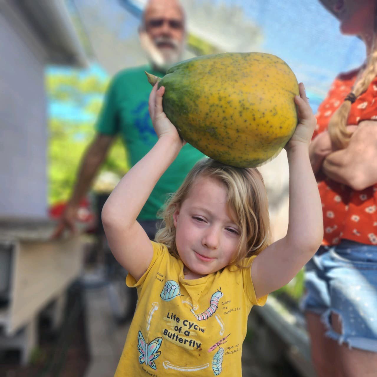 Nutritious and delicious fruit. Easy to grow in sun. Loves Florida heat. Lasts 3-5 years. Can be planted in our native sandy soil but you'll get more fruit if you give it more nutrition. We will top dress with homemade compost a few times a year. We also put food scraps at the base and cover with mulch. Also likes frequent water but does not like soil that stays moist. This is an unknown variety. Seeds are from our friend Albert Risemberg whose tree produces exceptionally sweet fruit within minimal musky flavor. He calls it "the good kind."